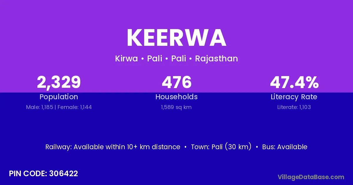 Pali (30 km) is the nearest town to Keerwa village for major economic activities and is located approximately 30 km away.