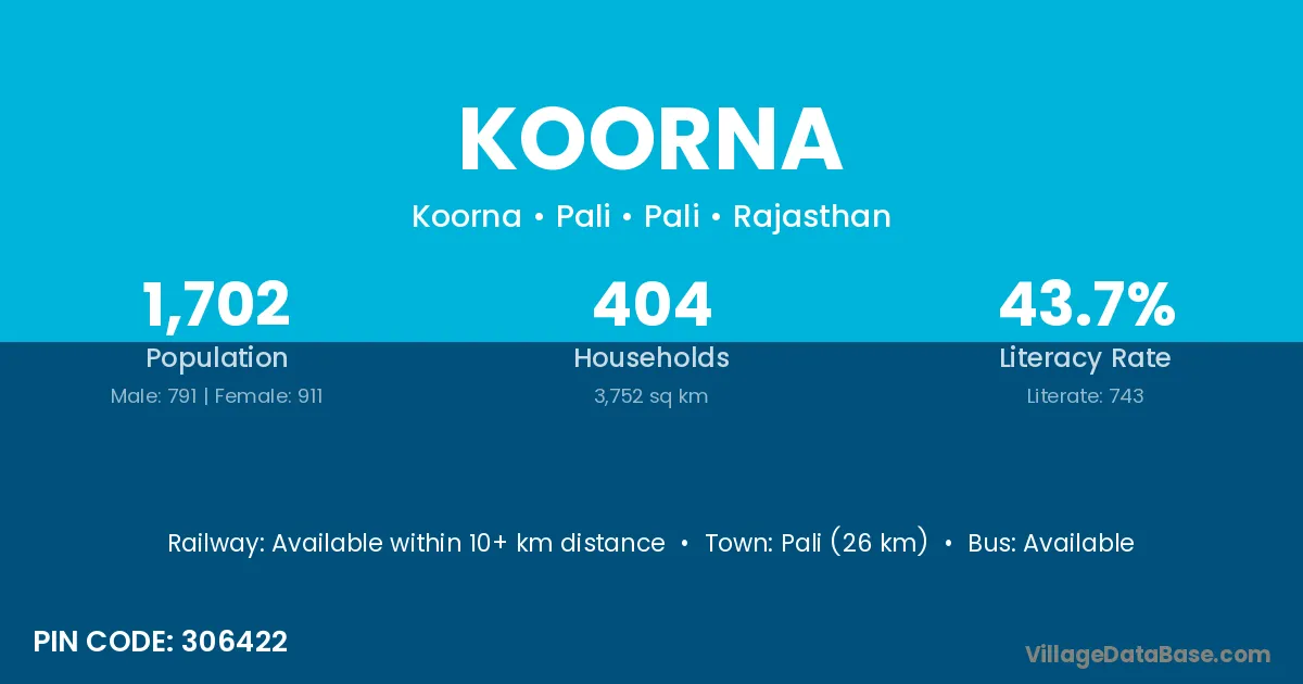 Pali (26 km) is the nearest town to Koorna village for major economic activities and is located approximately 26 km away.