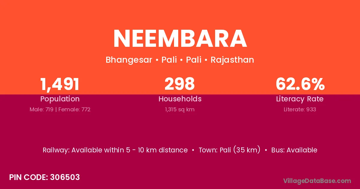 Pali (35 km) is the nearest town to Neembara village for major economic activities and is located approximately 35 km away.