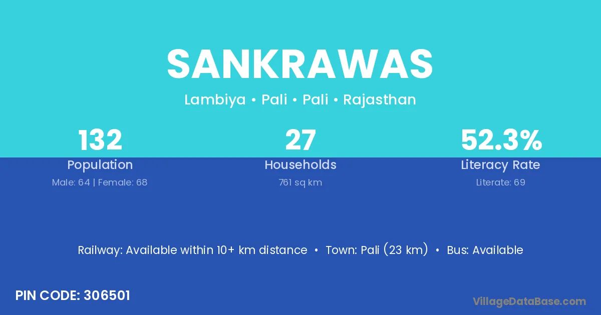 Pali (23 km) is the nearest town to Sankrawas village for major economic activities and is located approximately 23 km away.
