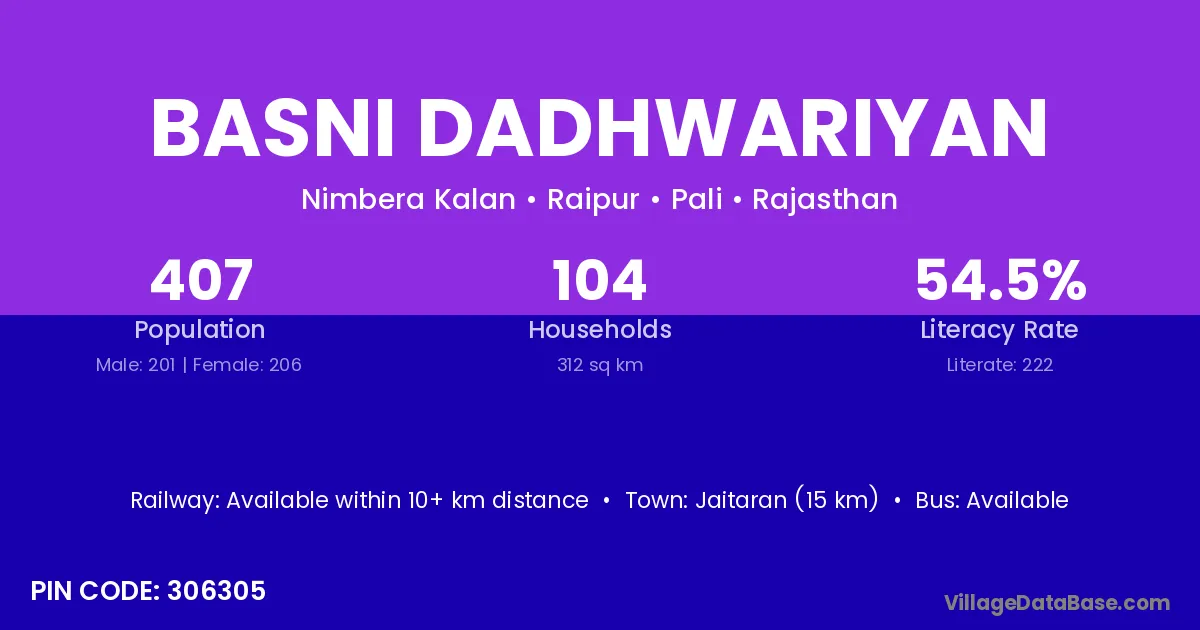 Basni Dadhwariyan village has a total population of 407 people, of which 201 are males and 206 are females.