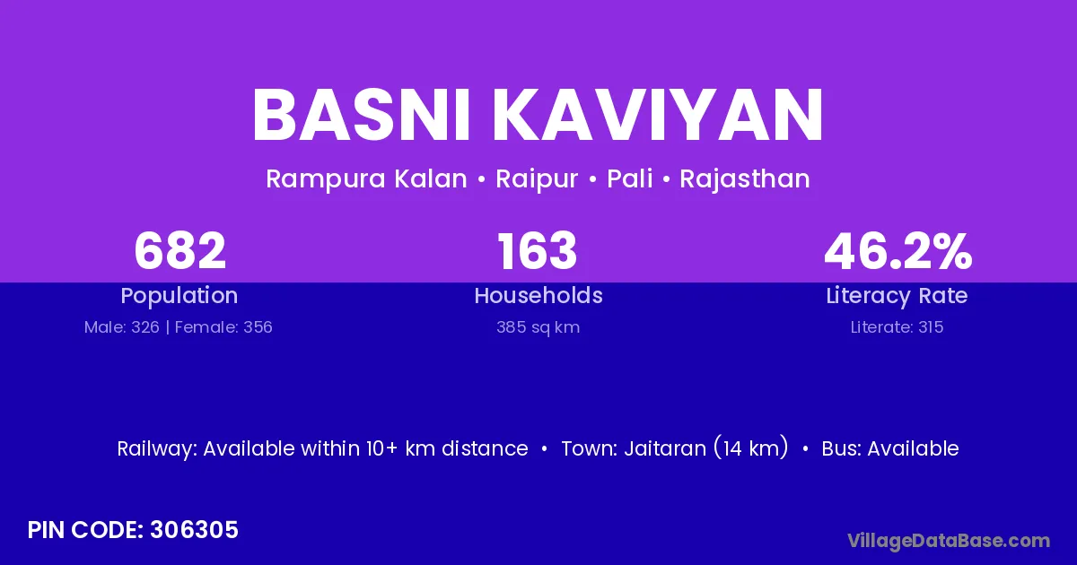 Jaitaran (14 km) is the nearest town to Basni Kaviyan village for major economic activities and is located approximately 14 km away.