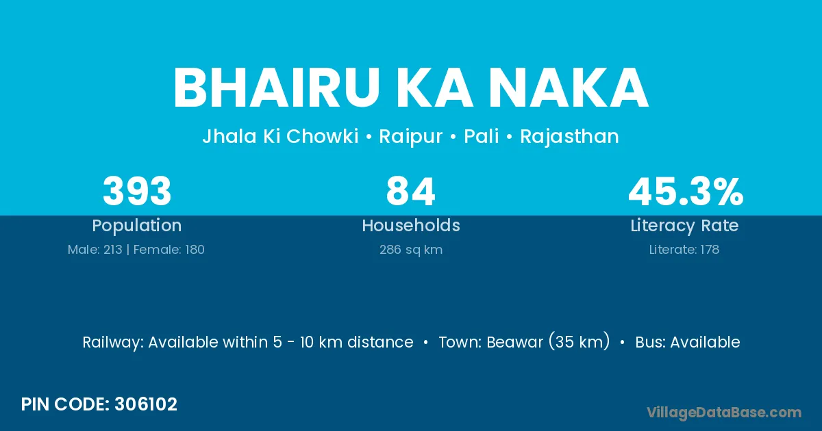 Bhairu Ka Naka village has a total population of 393 people, of which 213 are males and 180 are females.