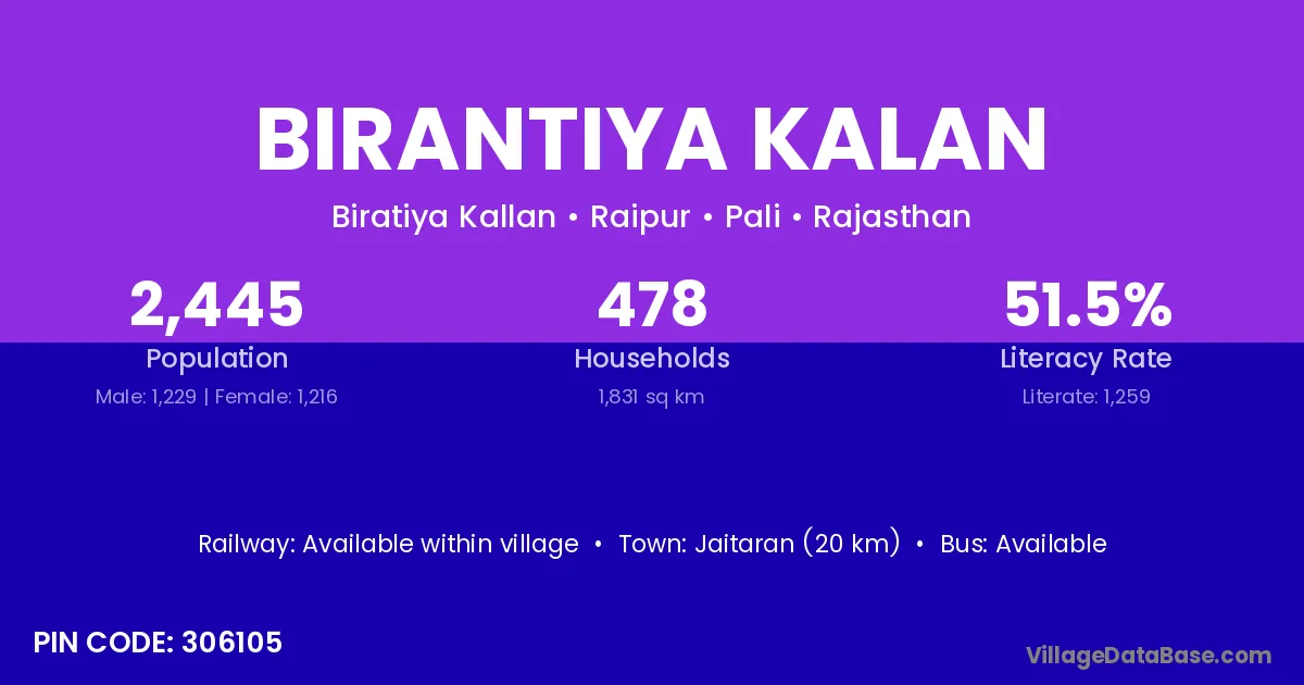 Jaitaran (20 km) is the nearest town to Birantiya Kalan village for major economic activities and is located approximately 20 km away.