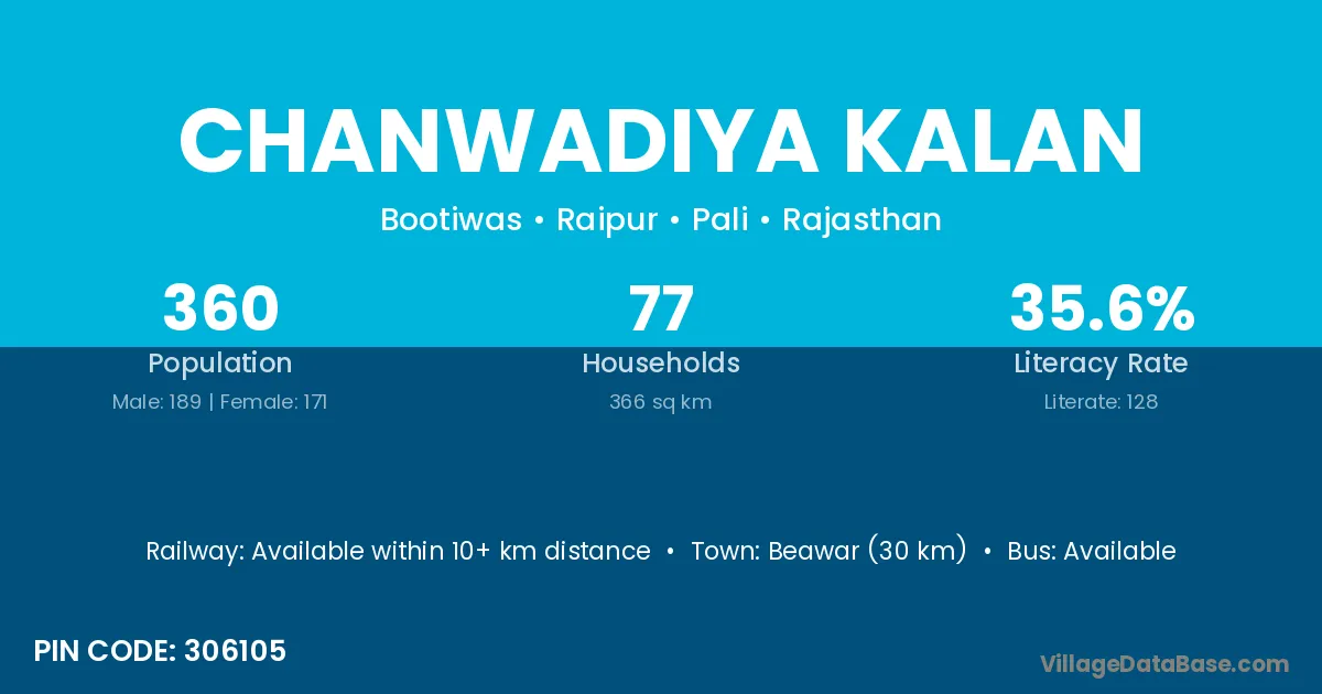 Beawar (30 km) is the nearest town to Chanwadiya Kalan village for major economic activities and is located approximately 30 km away.