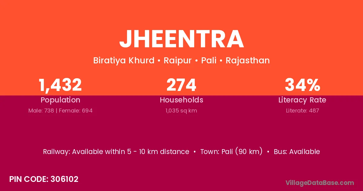 Pali (90 km) is the nearest town to Jheentra village for major economic activities and is located approximately 90 km away.