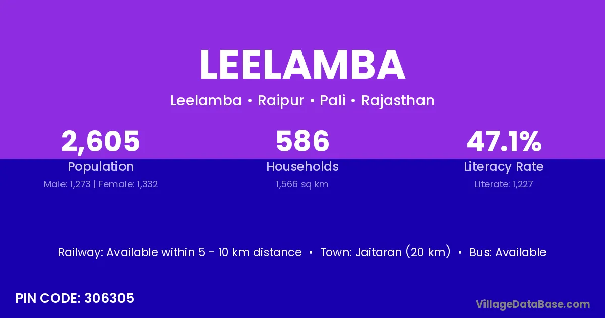 Jaitaran (20 km) is the nearest town to Leelamba village for major economic activities and is located approximately 20 km away.