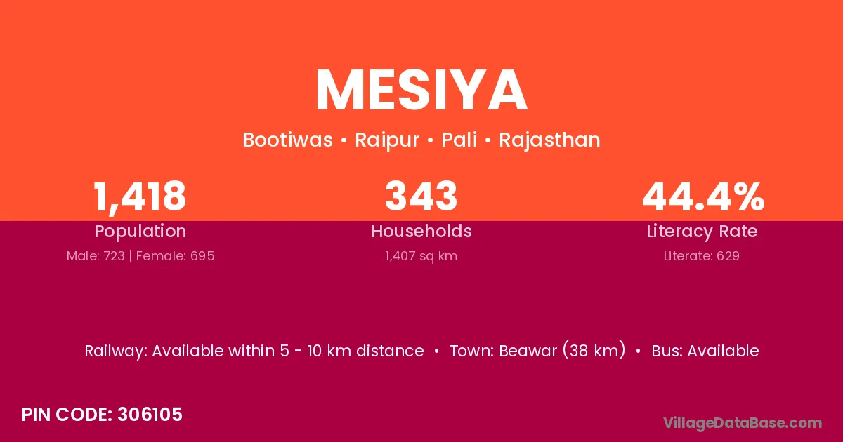 Beawar (38 km) is the nearest town to Mesiya village for major economic activities and is located approximately 38 km away.