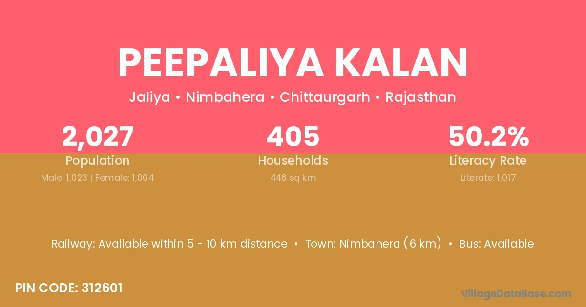 Jaitaran (15 km) is the nearest town to Peepaliya Kalan village for major economic activities and is located approximately 15 km away.