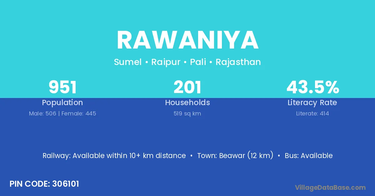 Rawaniya village has a total population of 951 people, of which 506 are males and 445 are females.