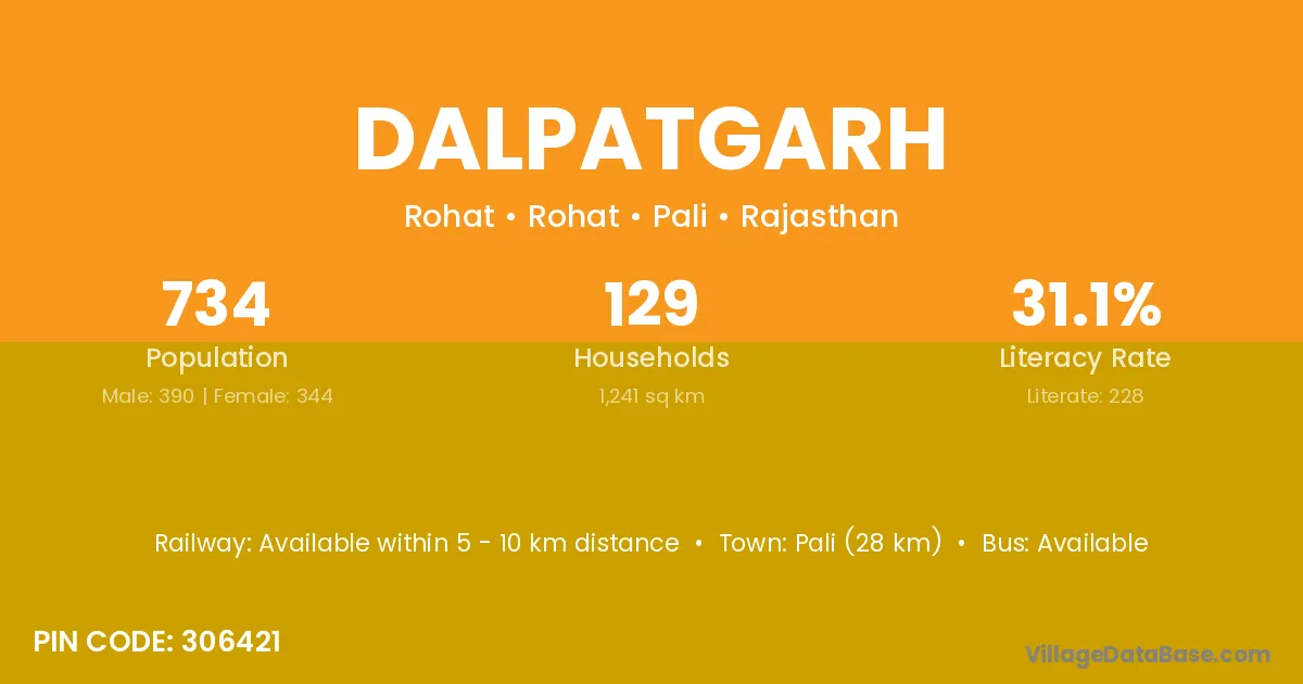 Pali (28 km) is the nearest town to Dalpatgarh village for major economic activities and is located approximately 28 km away.