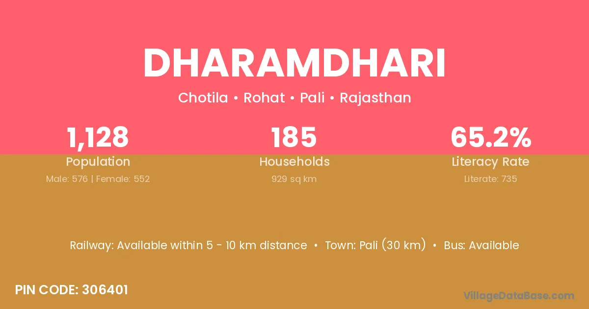 Pali (30 km) is the nearest town to Dharamdhari village for major economic activities and is located approximately 30 km away.