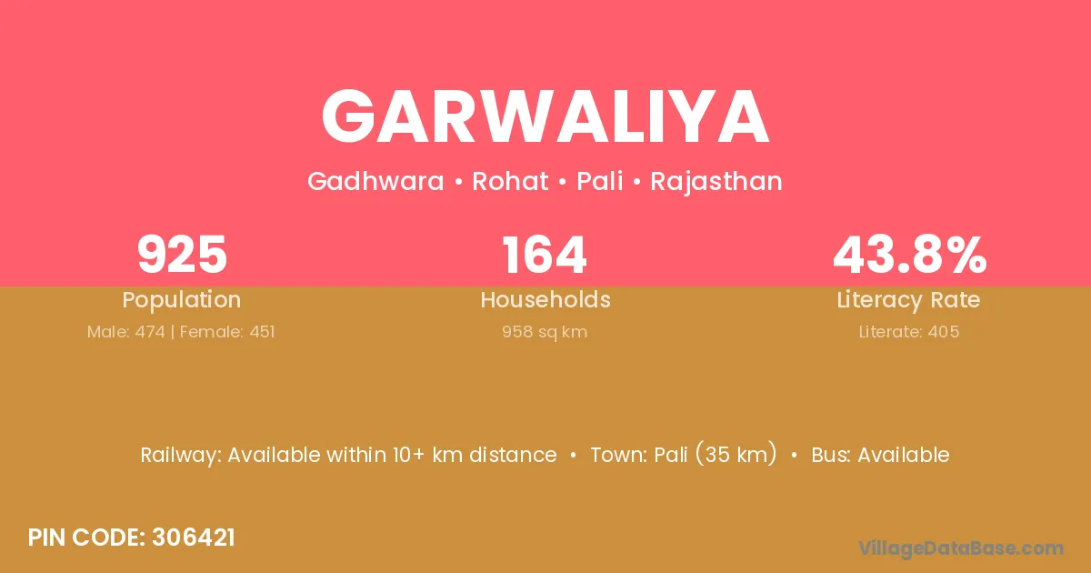 Pali (35 km) is the nearest town to Garwaliya village for major economic activities and is located approximately 35 km away.