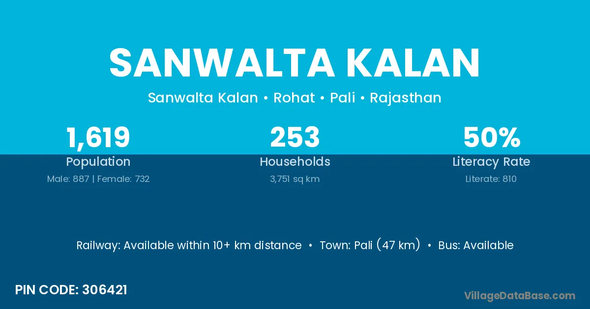 Pali (47 km) is the nearest town to Sanwalta Kalan village for major economic activities and is located approximately 47 km away.