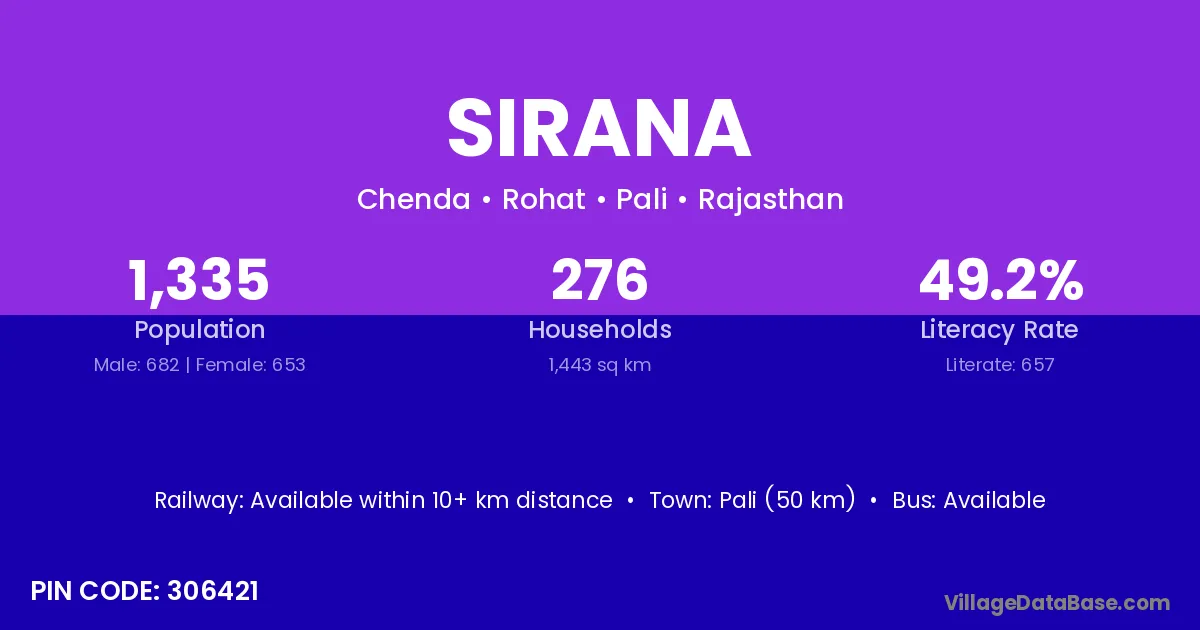 Pali (50 km) is the nearest town to Sirana village for major economic activities and is located approximately 50 km away.