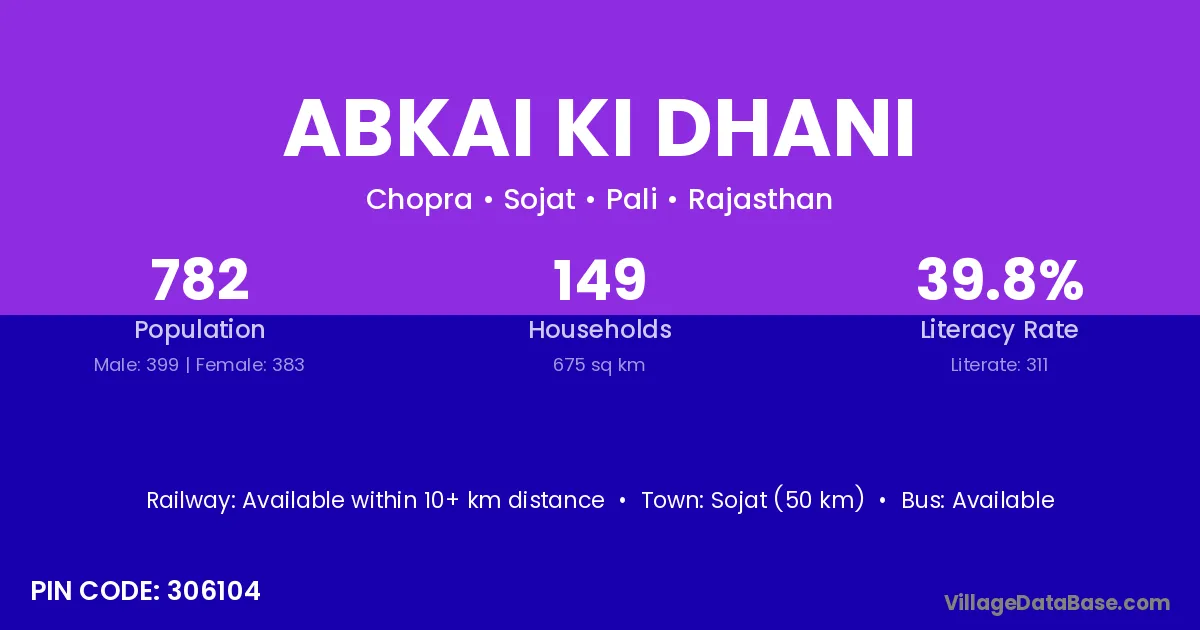 Sojat (50 km) is the nearest town to Abkai Ki Dhani village for major economic activities and is located approximately 50 km away.
