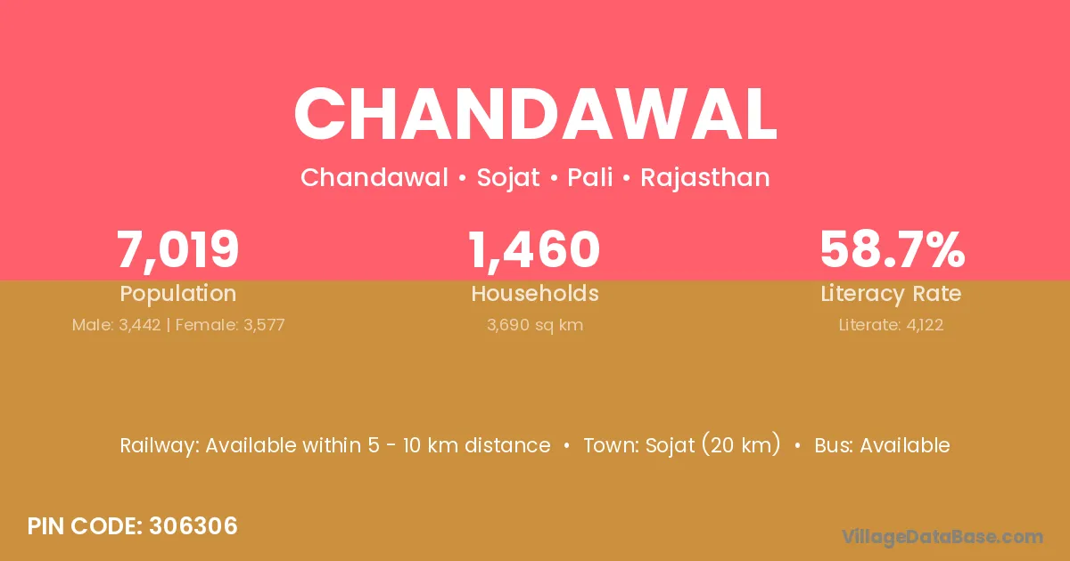 Sojat (20 km) is the nearest town to Chandawal village for major economic activities and is located approximately 20 km away.