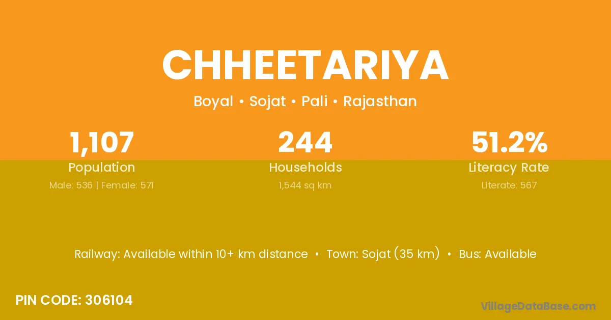 Sojat (35 km) is the nearest town to Chheetariya village for major economic activities and is located approximately 35 km away.