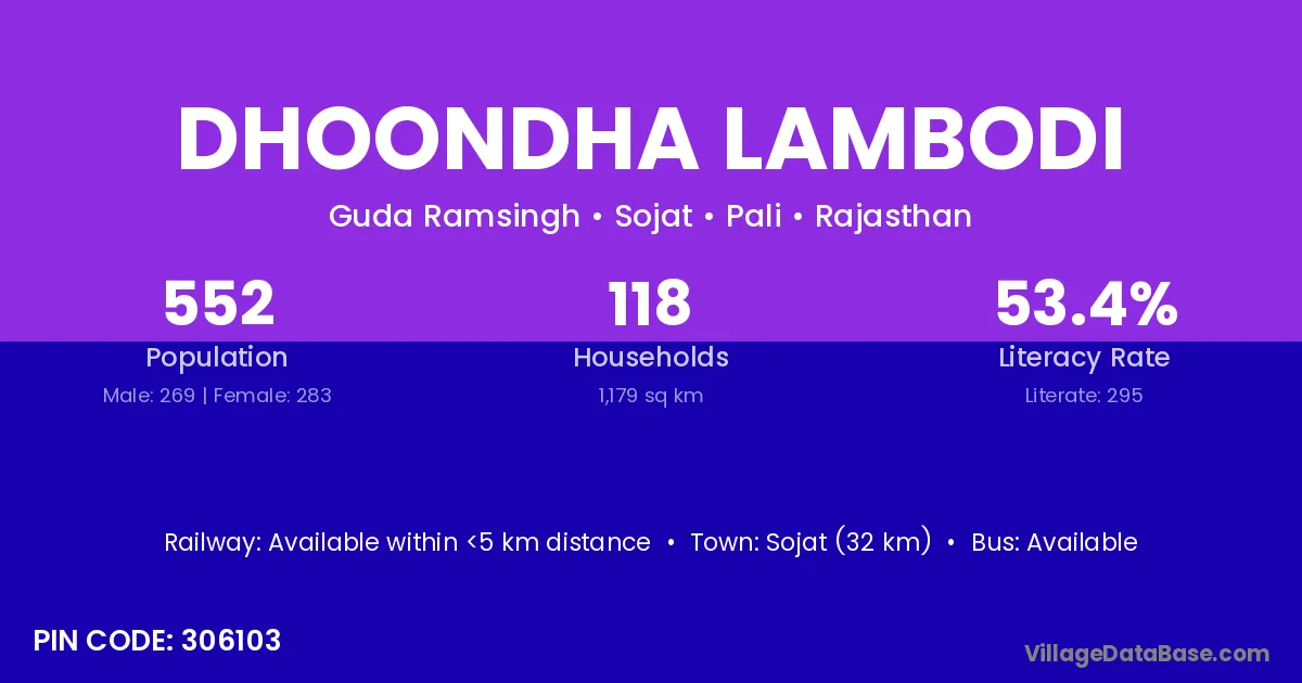 Sojat (32 km) is the nearest town to Dhoondha Lambodi village for major economic activities and is located approximately 32 km away.