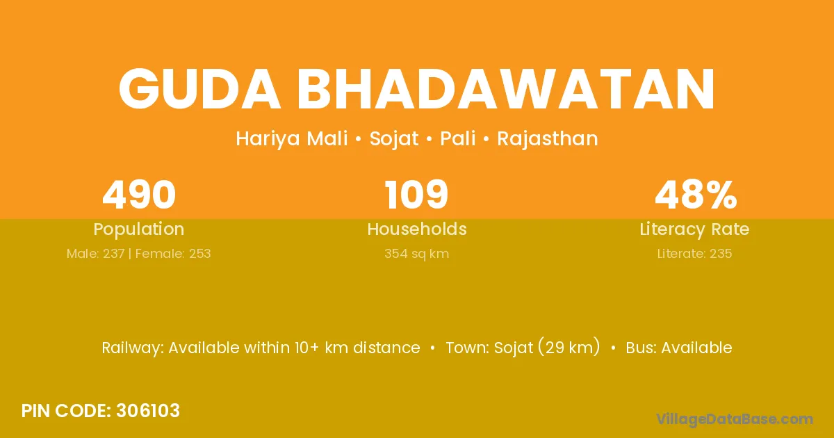 Guda Bhadawatan village has a total population of 490 people, of which 237 are males and 253 are females.