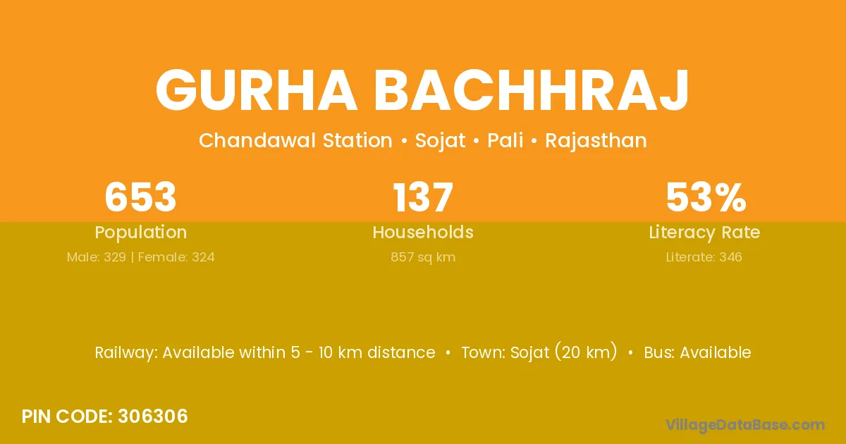 Sojat (20 km) is the nearest town to Gurha Bachhraj village for major economic activities and is located approximately 20 km away.