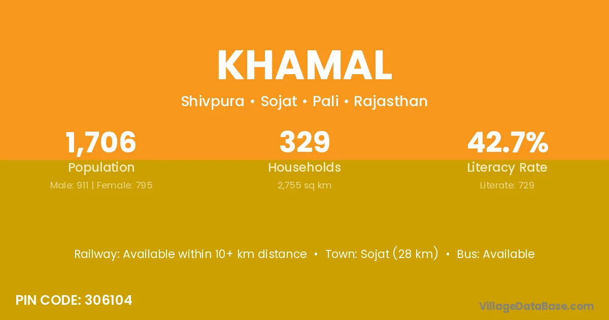 Sojat (28 km) is the nearest town to Khamal village for major economic activities and is located approximately 28 km away.