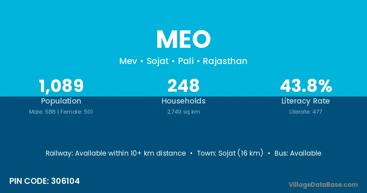 Sojat (16 km) is the nearest town to Meo village for major economic activities and is located approximately 16 km away.