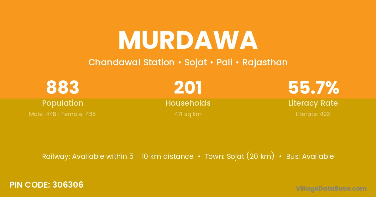 Sojat (20 km) is the nearest town to Murdawa village for major economic activities and is located approximately 20 km away.