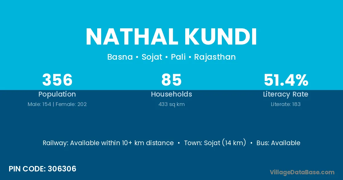 Sojat (14 km) is the nearest town to Nathal Kundi village for major economic activities and is located approximately 14 km away.