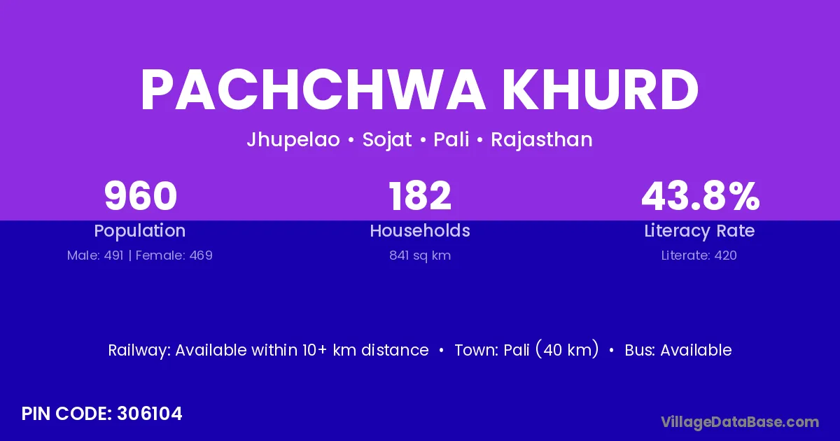 Pali (40 km) is the nearest town to Pachchwa Khurd village for major economic activities and is located approximately 40 km away.