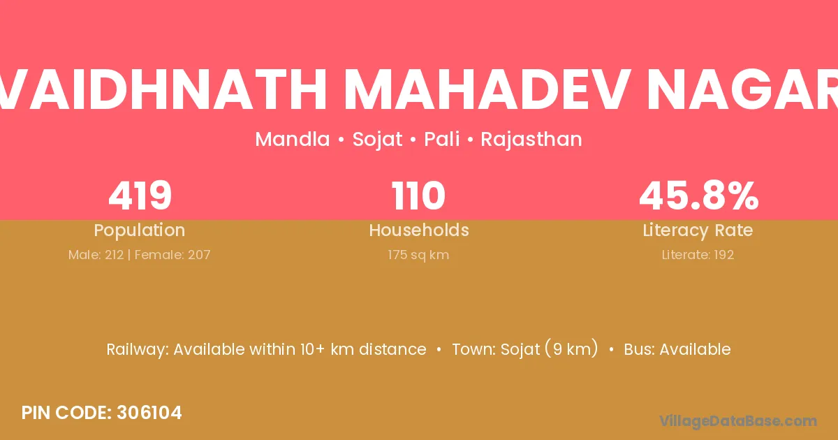 Sojat (9 km) is the nearest town to Vaidhnath Mahadev Nagar village for major economic activities and is located approximately 9 km away.