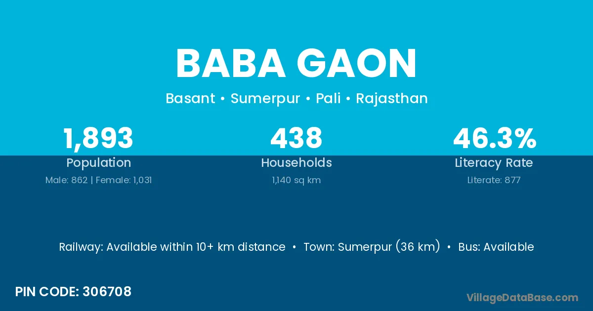 Sumerpur (36 km) is the nearest town to Baba Gaon village for major economic activities and is located approximately 36 km away.