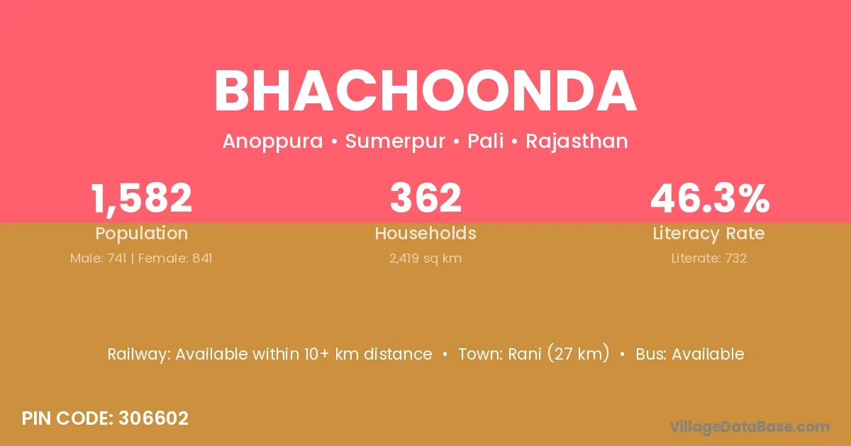 Bhachoonda village has a total population of 1,582 people, of which 741 are males and 841 are females.