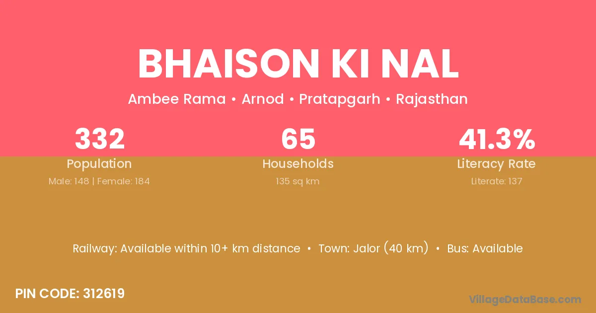 Jalor (40 km) is the nearest town to Bhaison Ki Nal village for major economic activities and is located approximately 40 km away.