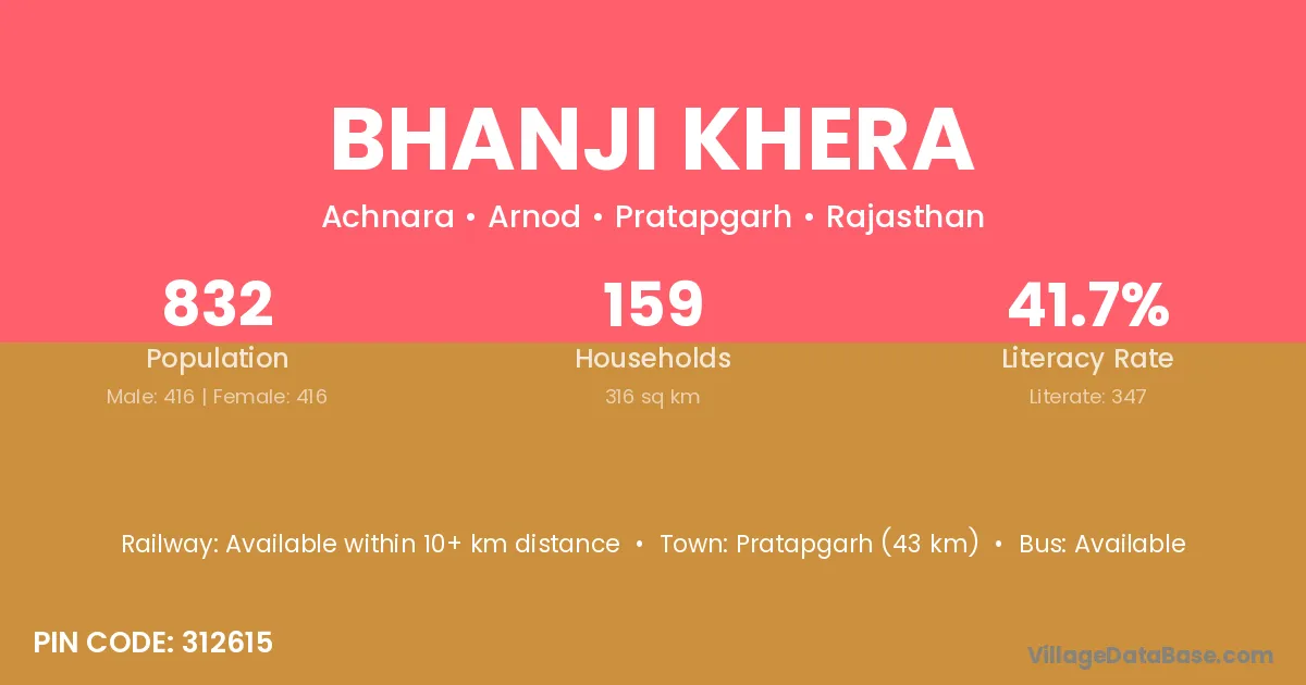 Pratapgarh (43 km) is the nearest town to Bhanji Khera village for major economic activities and is located approximately 43 km away.