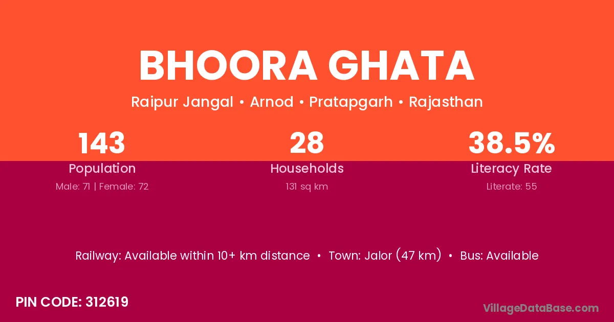 Bhoora Ghata village has a total population of 143 people, of which 71 are males and 72 are females.