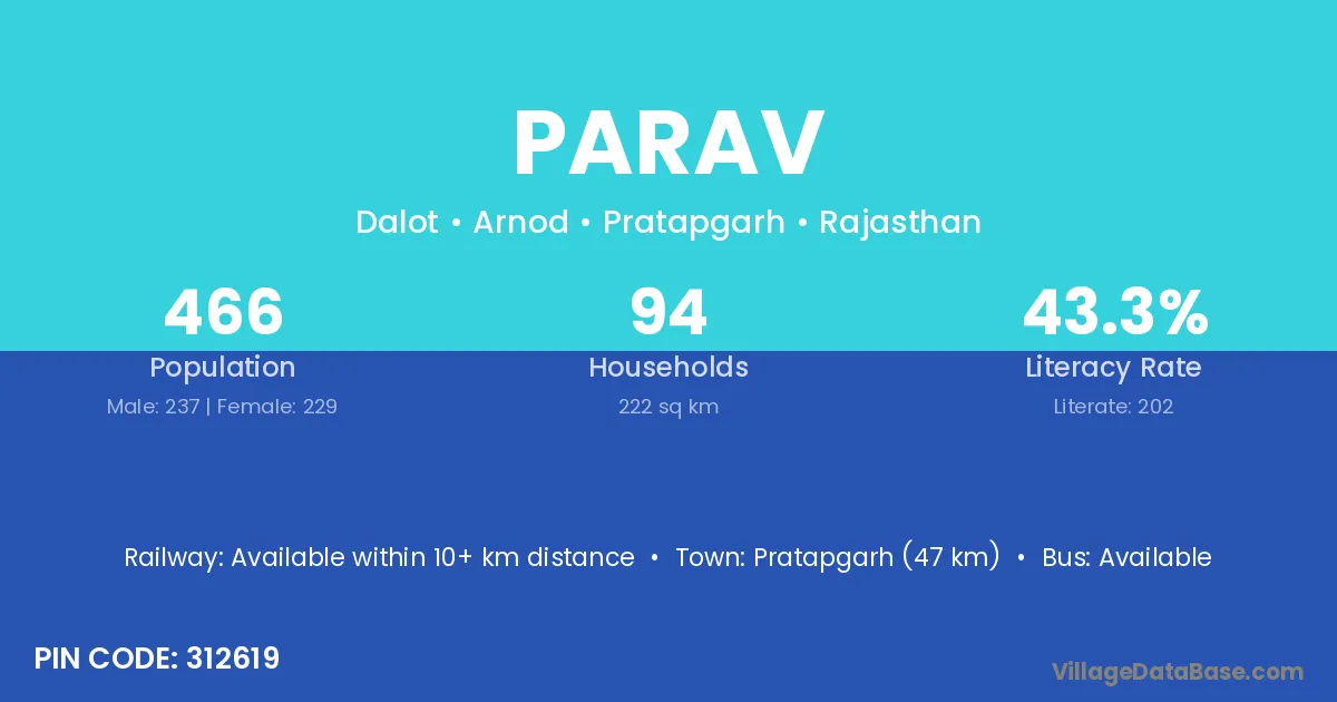 Pratapgarh (47 km) is the nearest town to Parav village for major economic activities and is located approximately 47 km away.