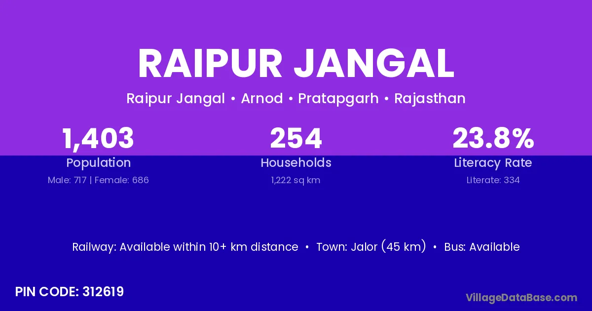 Jalor (45 km) is the nearest town to Raipur Jangal village for major economic activities and is located approximately 45 km away.