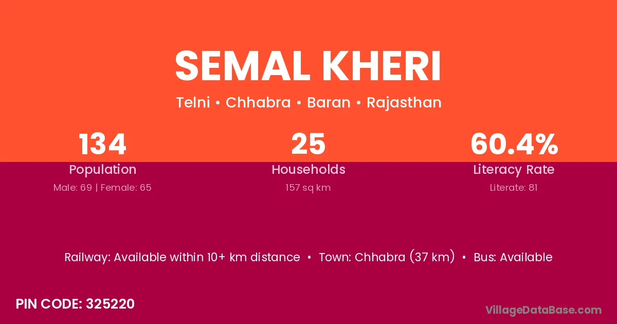 Udaipur (47 km) is the nearest town to Semal Kheri village for major economic activities and is located approximately 47 km away.