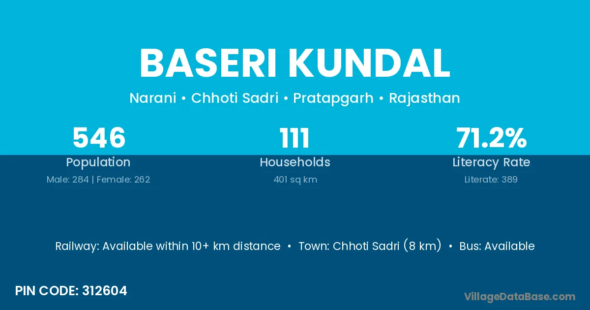 Chhoti Sadri (8 km) is the nearest town to Baseri Kundal village for major economic activities and is located approximately 8 km away.