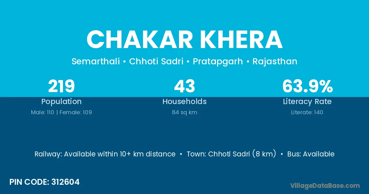 Chhoti Sadri (8 km) is the nearest town to Chakar Khera village for major economic activities and is located approximately 8 km away.