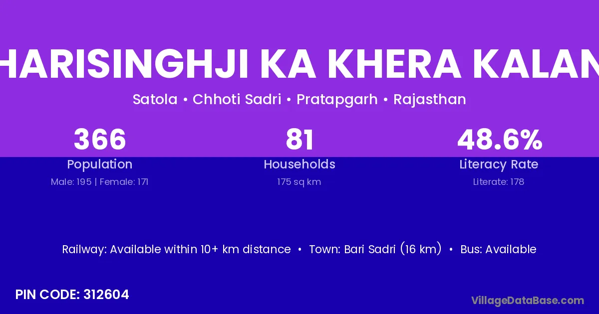 Harisinghji Ka Khera Kalan village has a total population of 366 people, of which 195 are males and 171 are females.