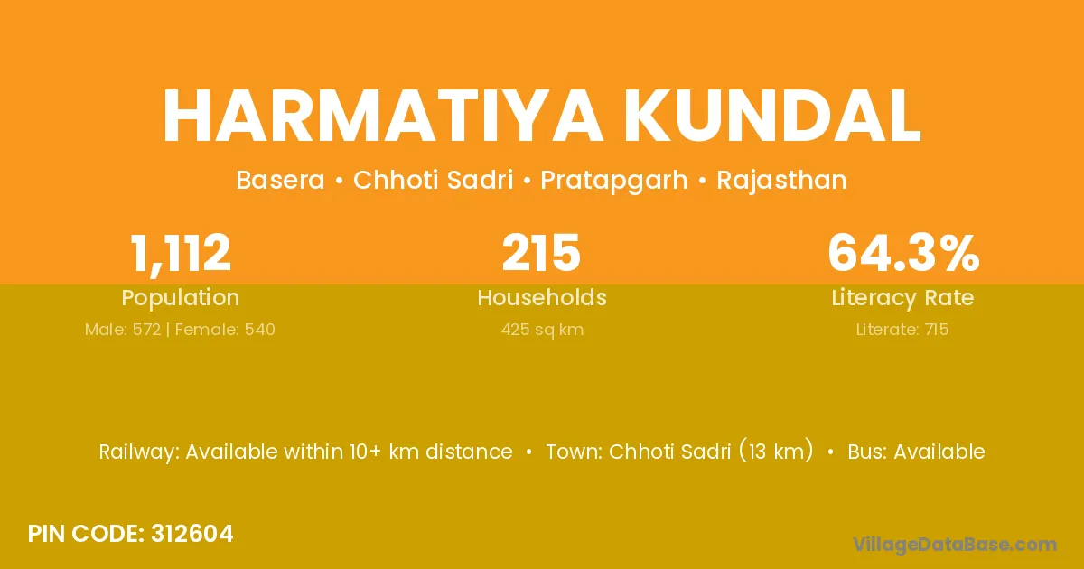 Chhoti Sadri (13 km) is the nearest town to Harmatiya Kundal village for major economic activities and is located approximately 13 km away.