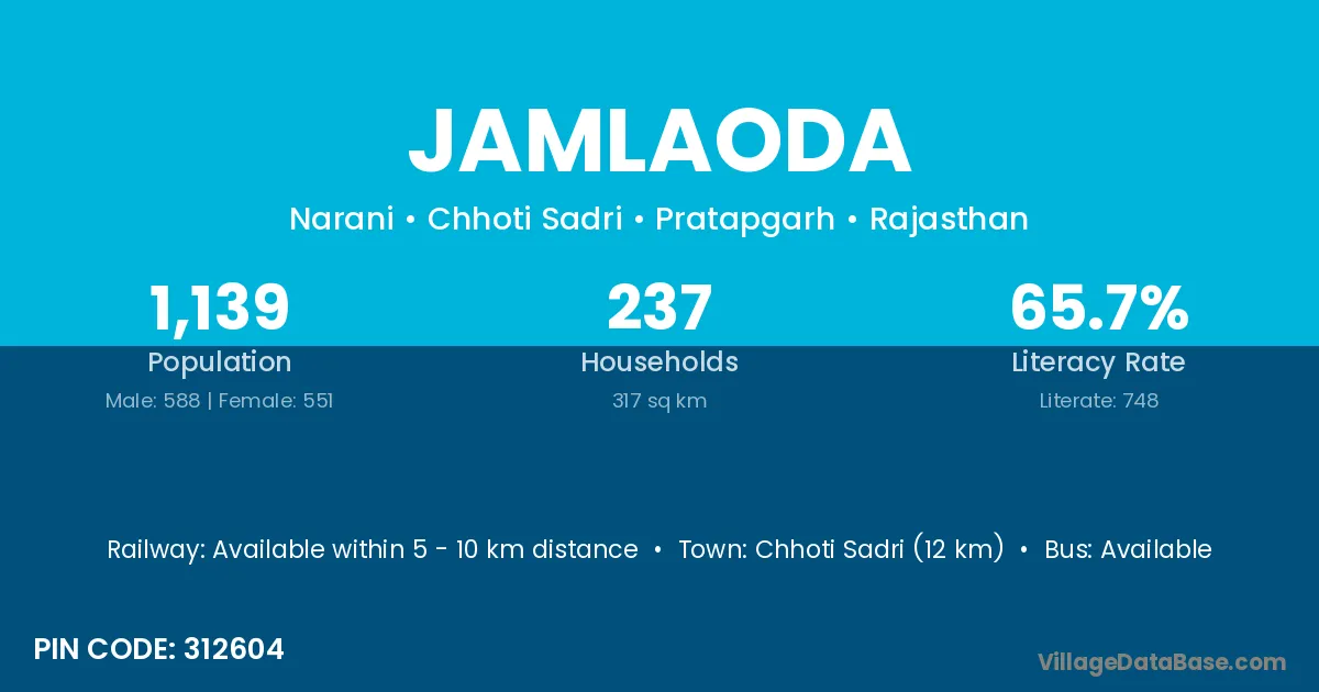Chhoti Sadri (12 km) is the nearest town to Jamlaoda village for major economic activities and is located approximately 12 km away.