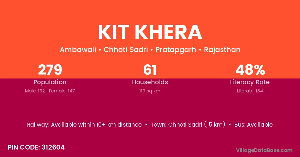 Chhoti Sadri (15 km) is the nearest town to Kit Khera village for major economic activities and is located approximately 15 km away.