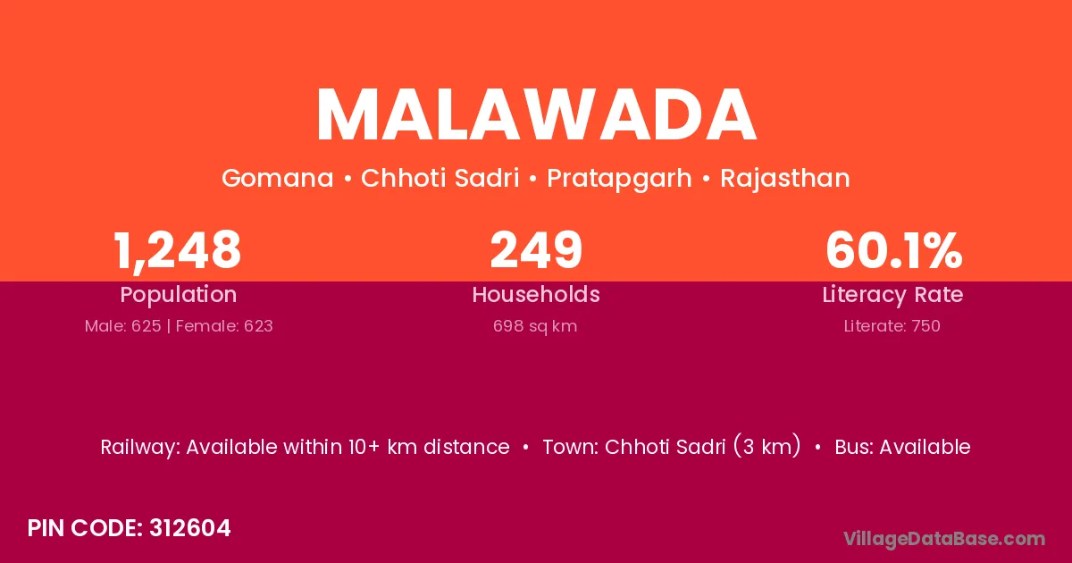 Chhoti Sadri (3 km) is the nearest town to Malawada village for major economic activities and is located approximately 3 km away.