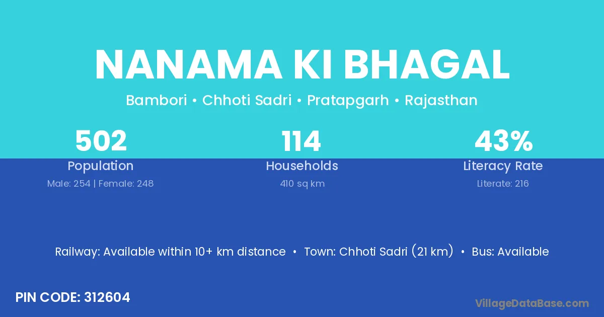 Nanama Ki Bhagal village has a total population of 502 people, of which 254 are males and 248 are females.