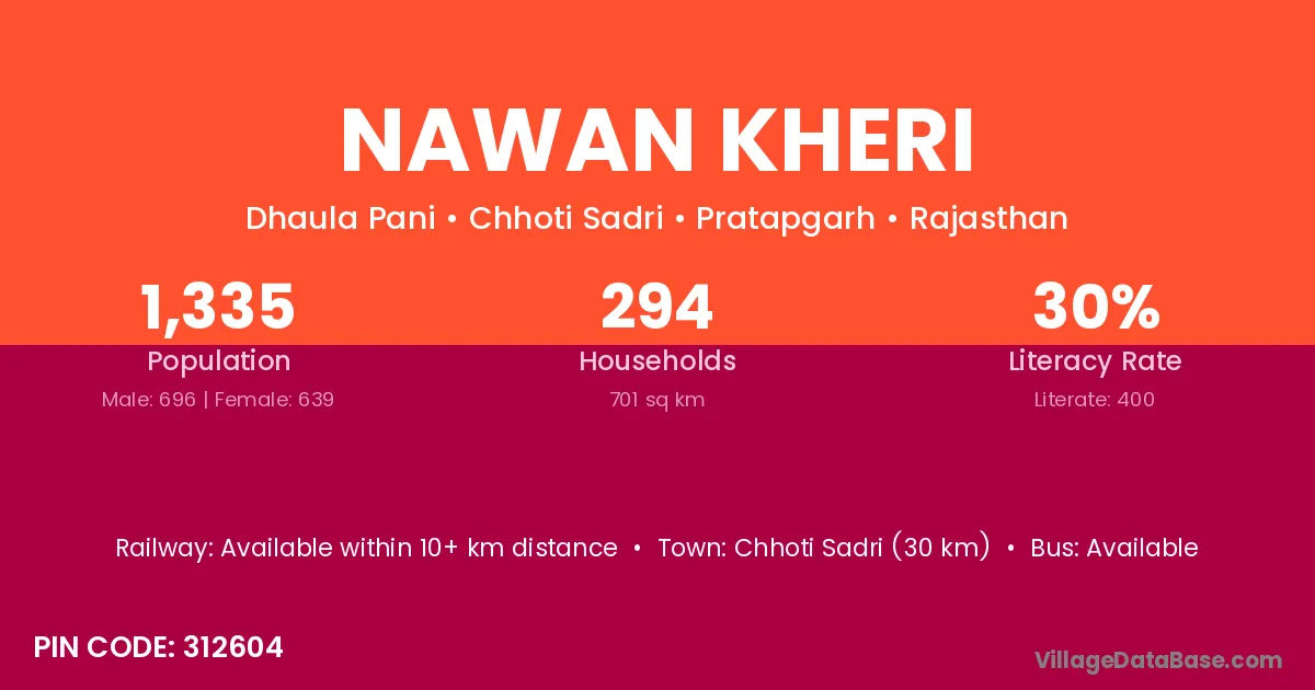 Chhoti Sadri (30 km) is the nearest town to Nawan Kheri village for major economic activities and is located approximately 30 km away.
