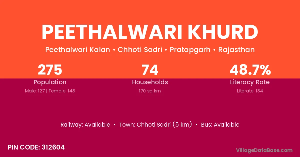 Chhoti Sadri (5 km) is the nearest town to Peethalwari Khurd village for major economic activities and is located approximately 5 km away.