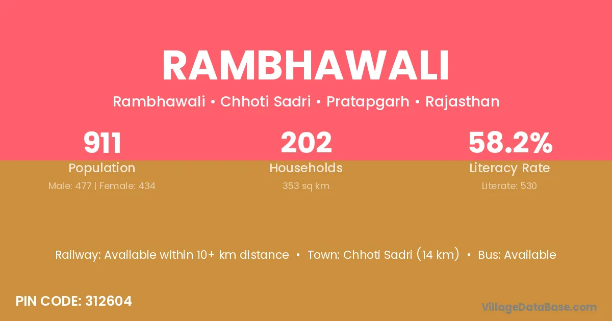 Chhoti Sadri (14 km) is the nearest town to Rambhawali village for major economic activities and is located approximately 14 km away.